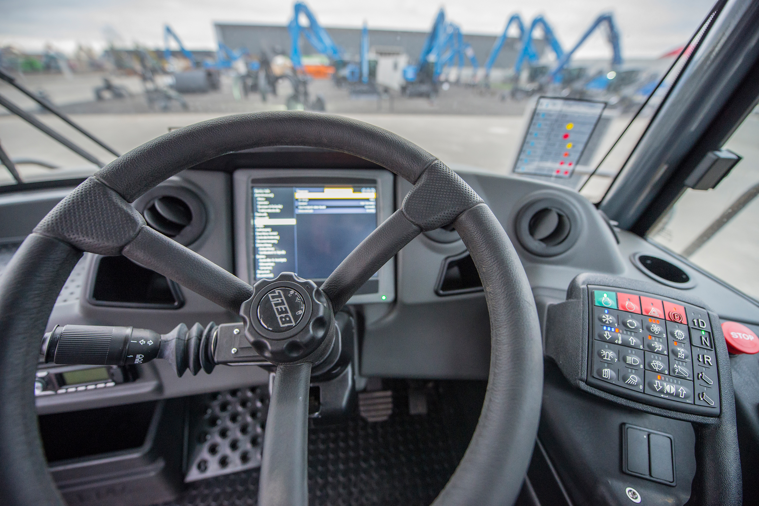 Kabina o niskim poziomie hałasu oferuje operatorowi szczególnie przyjemne środowisko pracy dzięki ergonomicznie rozmieszczonemu sterowaniu, regulowanej kolumnie kierownicy, dużej izolowanej chłodnicy i innym funkcjom.